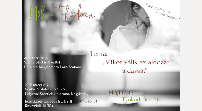 A nagyböjti készület időszakában különösen fontos, hogy időt szánjunk önmagunk, hivatásunk és áldozatvállalásunk mélyebb megértésére. A „Nők a tükörben” sorozat következő alkalma erre a belső útra hívja a résztvevőket, segítve a mindennapi élet kihívásainak hit fényében való szemlélését.