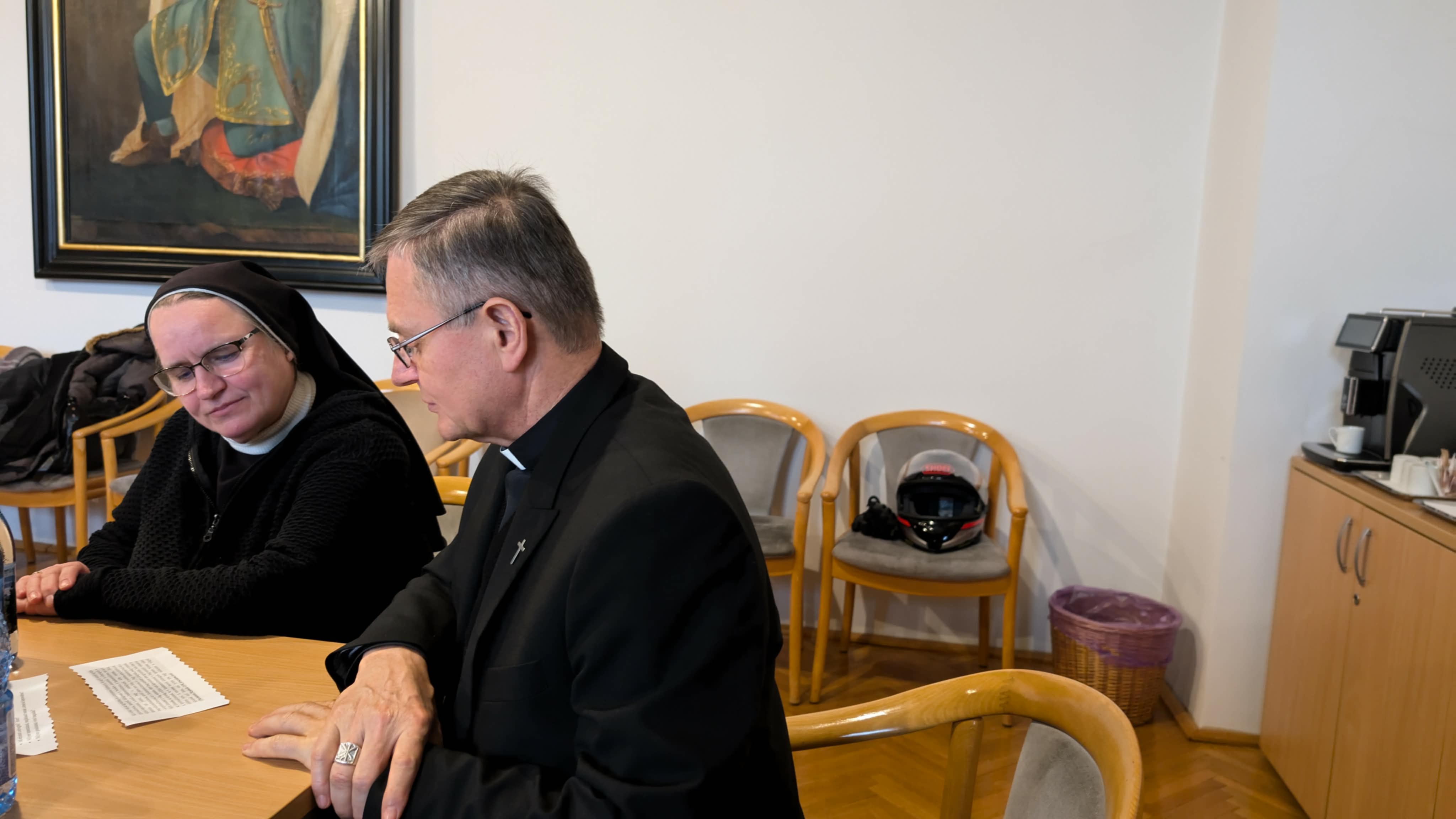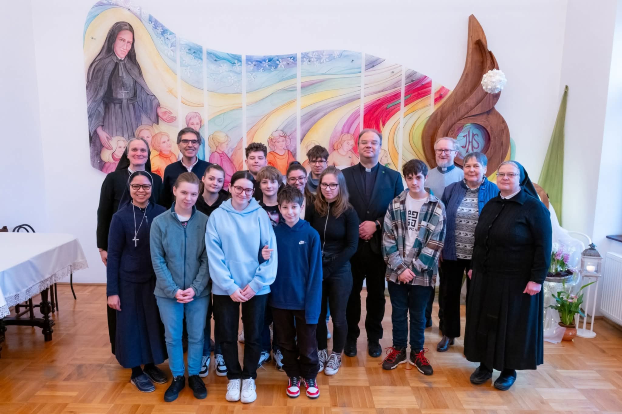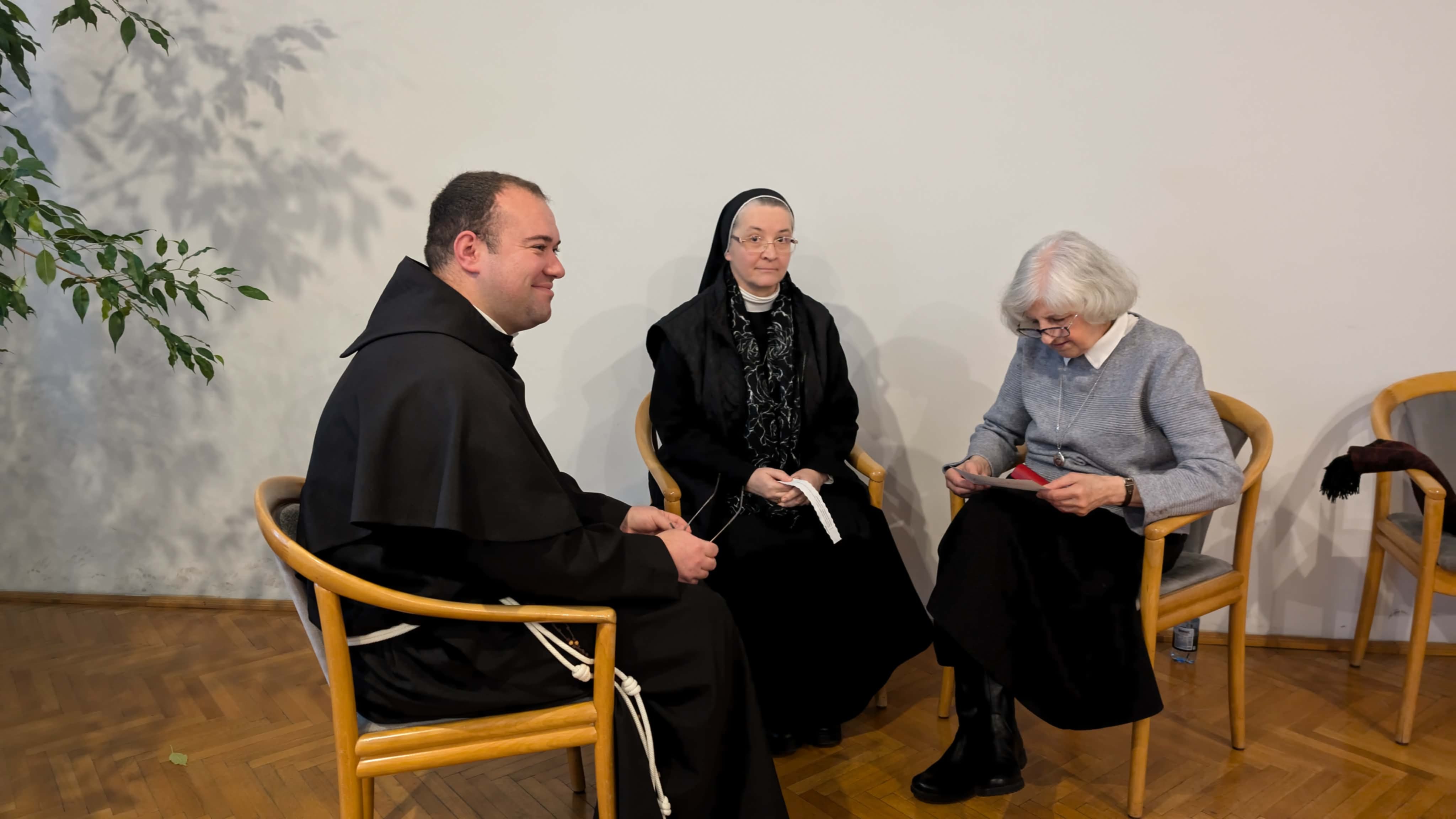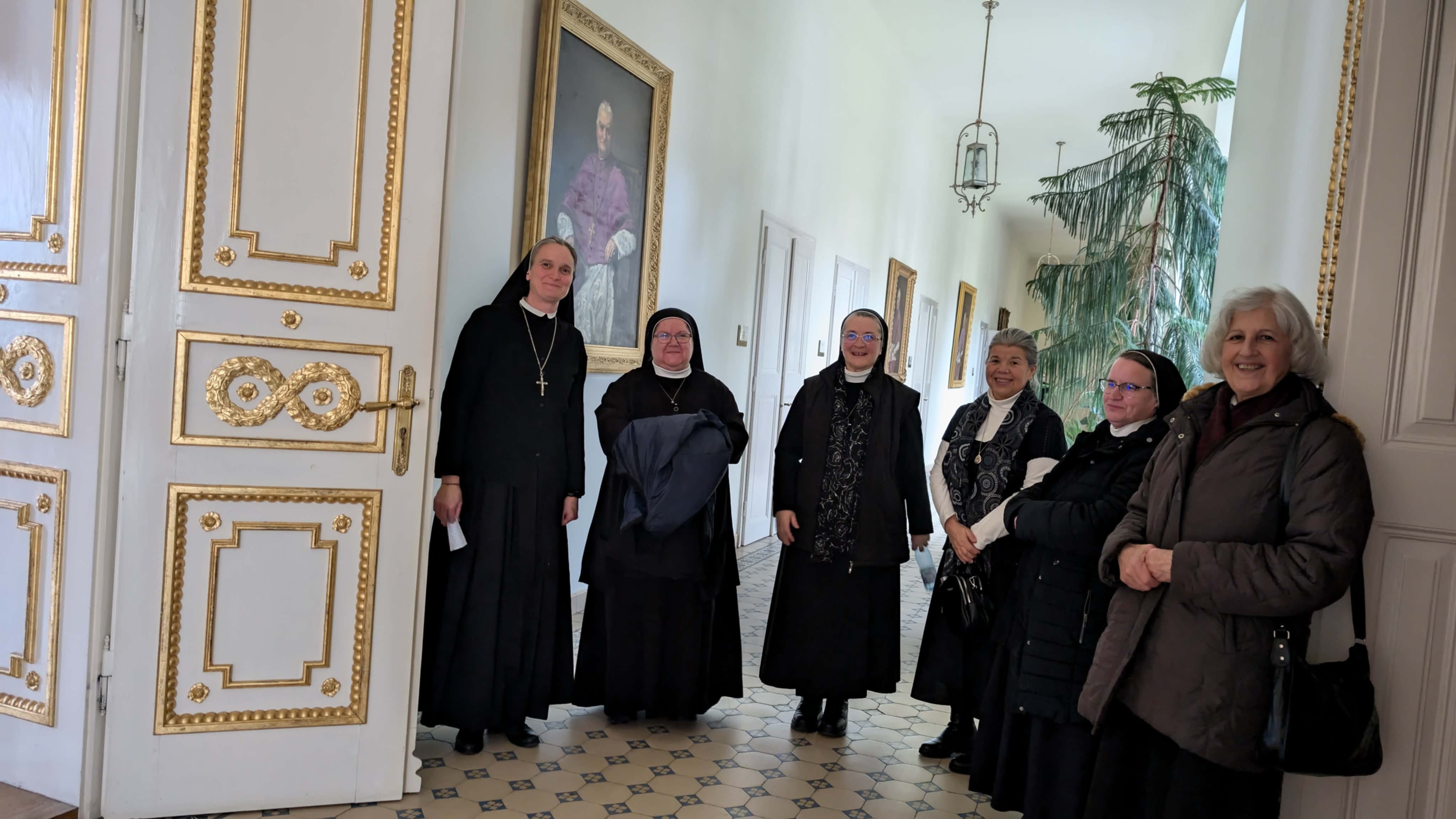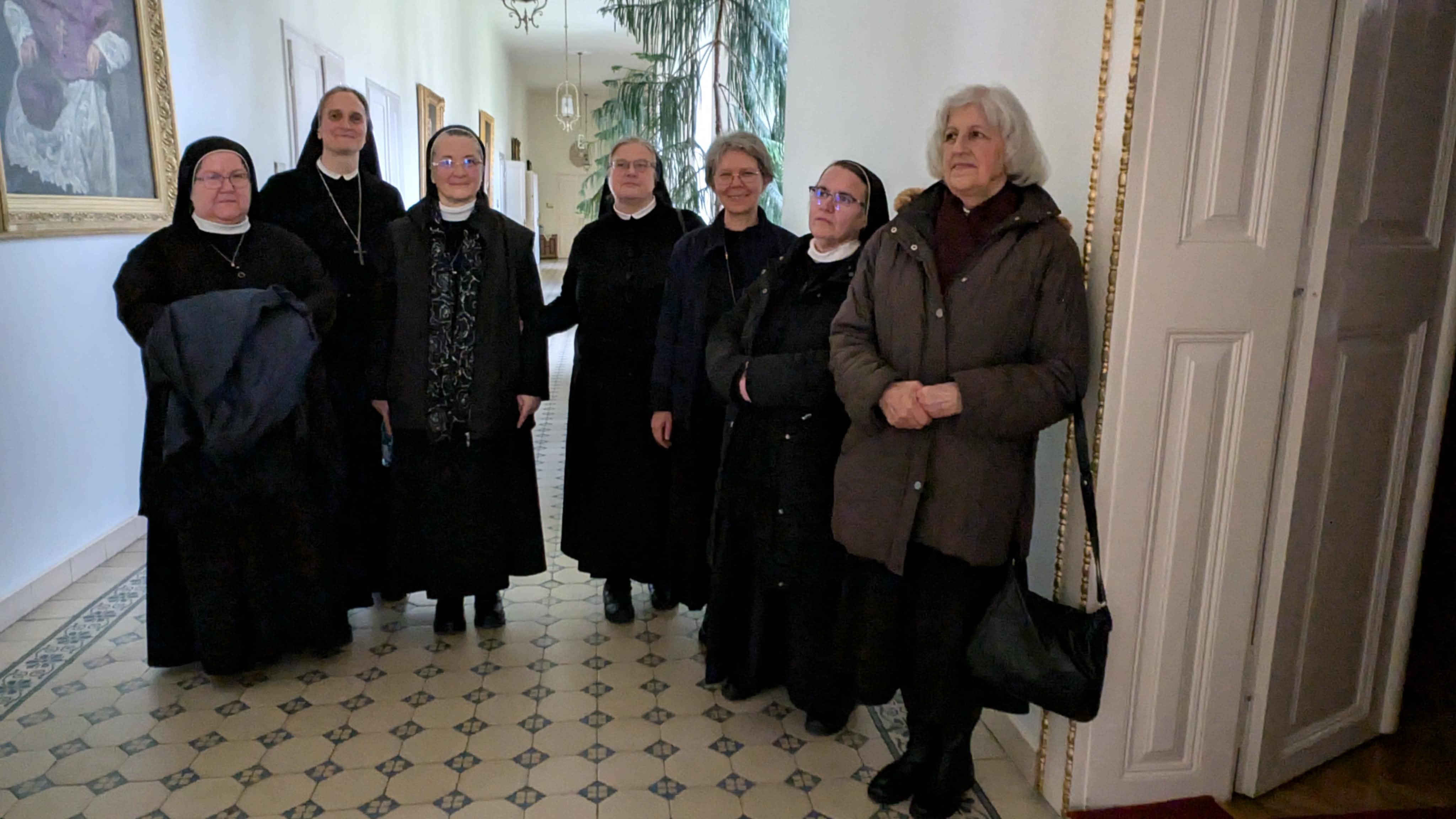A délelőtt lezárásaként a résztvevők elimádkozták a déli zsolozsmát, majd a program közös ebéddel folytatódott, amihez csatlakoztak a piarista szerzetesek is, Carles Gil i Saguer SchP generális, Jacek Wolan SchP generális asszisztens, Zsódi Viktor SchP tartományfőnök és a piarista nővérek. A vendégek a szombat délelőtt folyamán, tartományi vizitáció keretében látogatást tettek a nagykárolyi piarista nővérek gyermekotthonában, ahol találkoztak az ott élő gyerekekkel, fiatalokkal és munkatársakkal. Ennek a látogatásnak a következő állomása volt a szatmári püspöki palota, ahol a jó hangulatú ebéd után a püspök atya vezetésével a szerzetesek a kápolnában közös imádságra gyűltek össze, hálát adva hivatásuk ajándékáért és kérve Isten áldását további életükre, szolgálatukra.