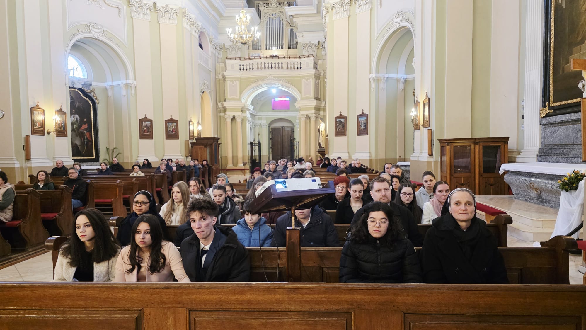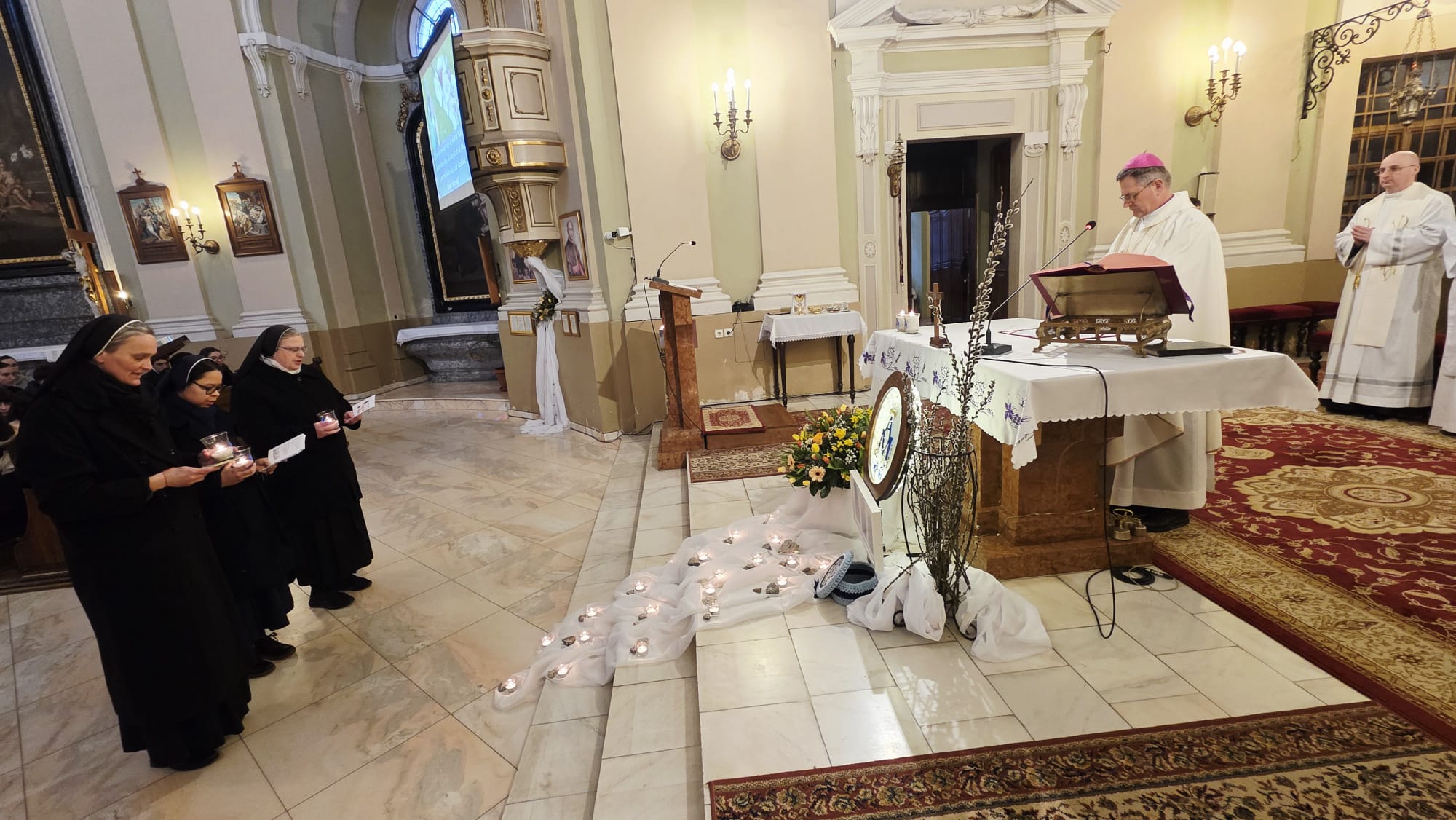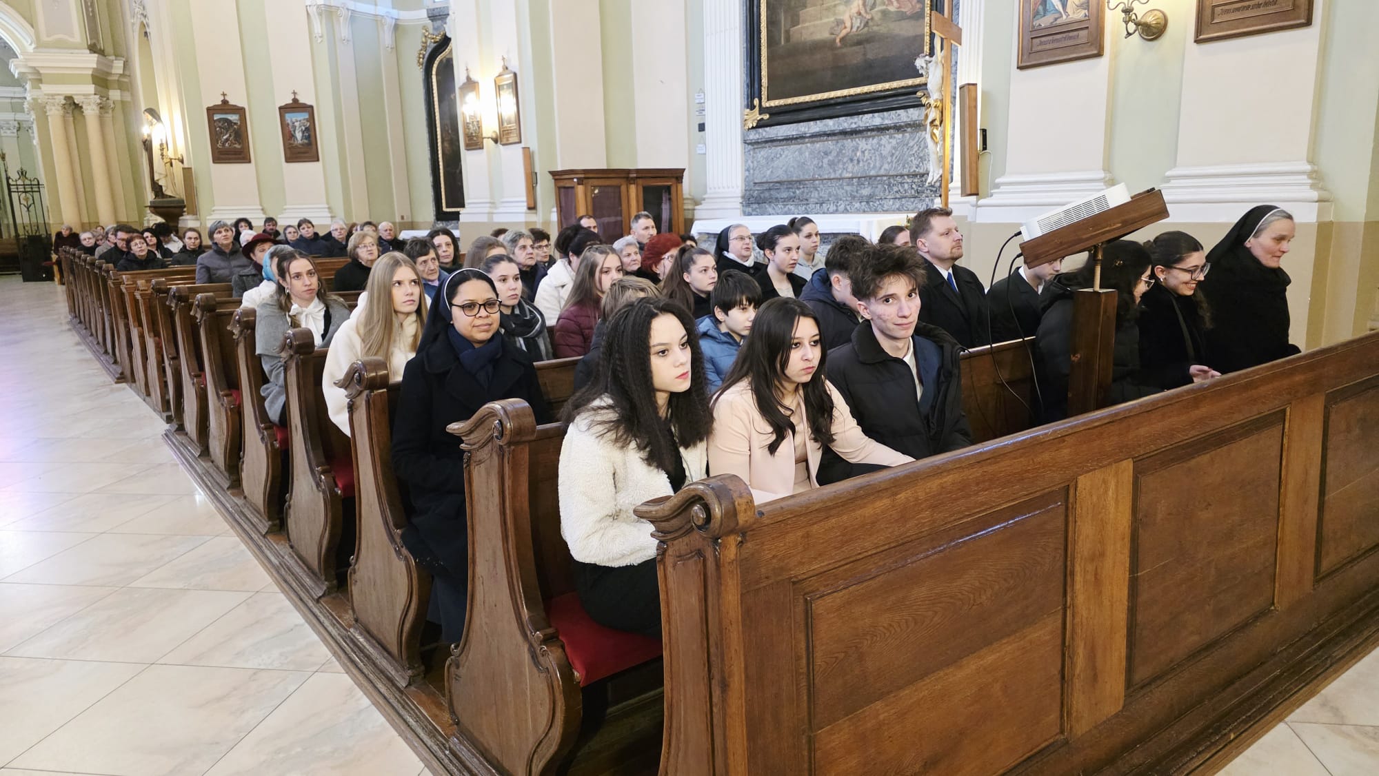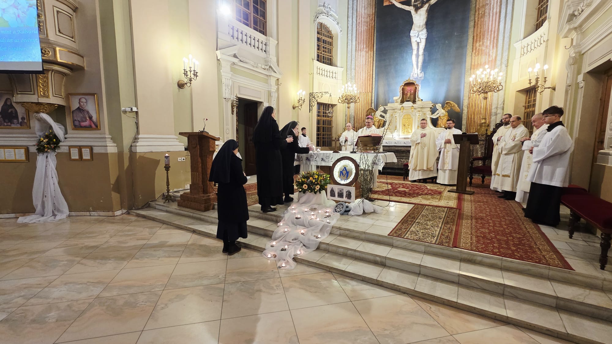 Az evangélium felolvasását követően a közösség megható pillanatnak lehetett tanúja: a három piarista nővér – Ágnes, Bori és Dania nővérek – ünnepélyes keretek között megújították szerzetesi fogadalmukat, megerősítve Krisztushoz és hivatásukhoz való hűségüket.