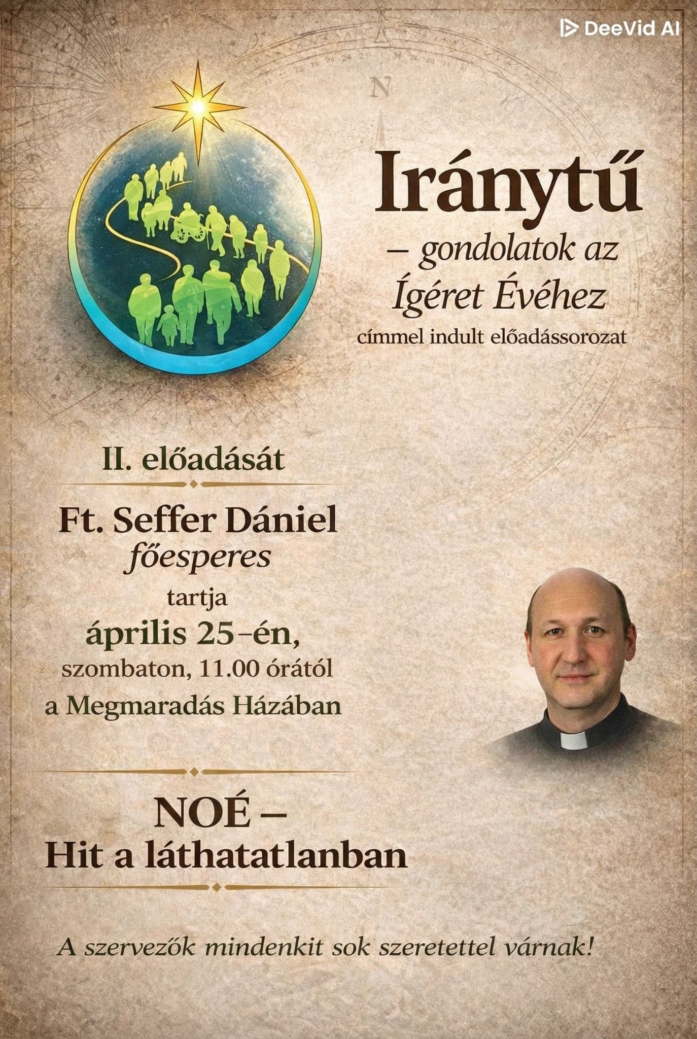 A sorozat második előadását Ft. Seffer Dániel tartja április 25-én, szombaton 11 órától a Megmaradás Házában, „NOÉ – Hit a láthatatlanban” címmel.