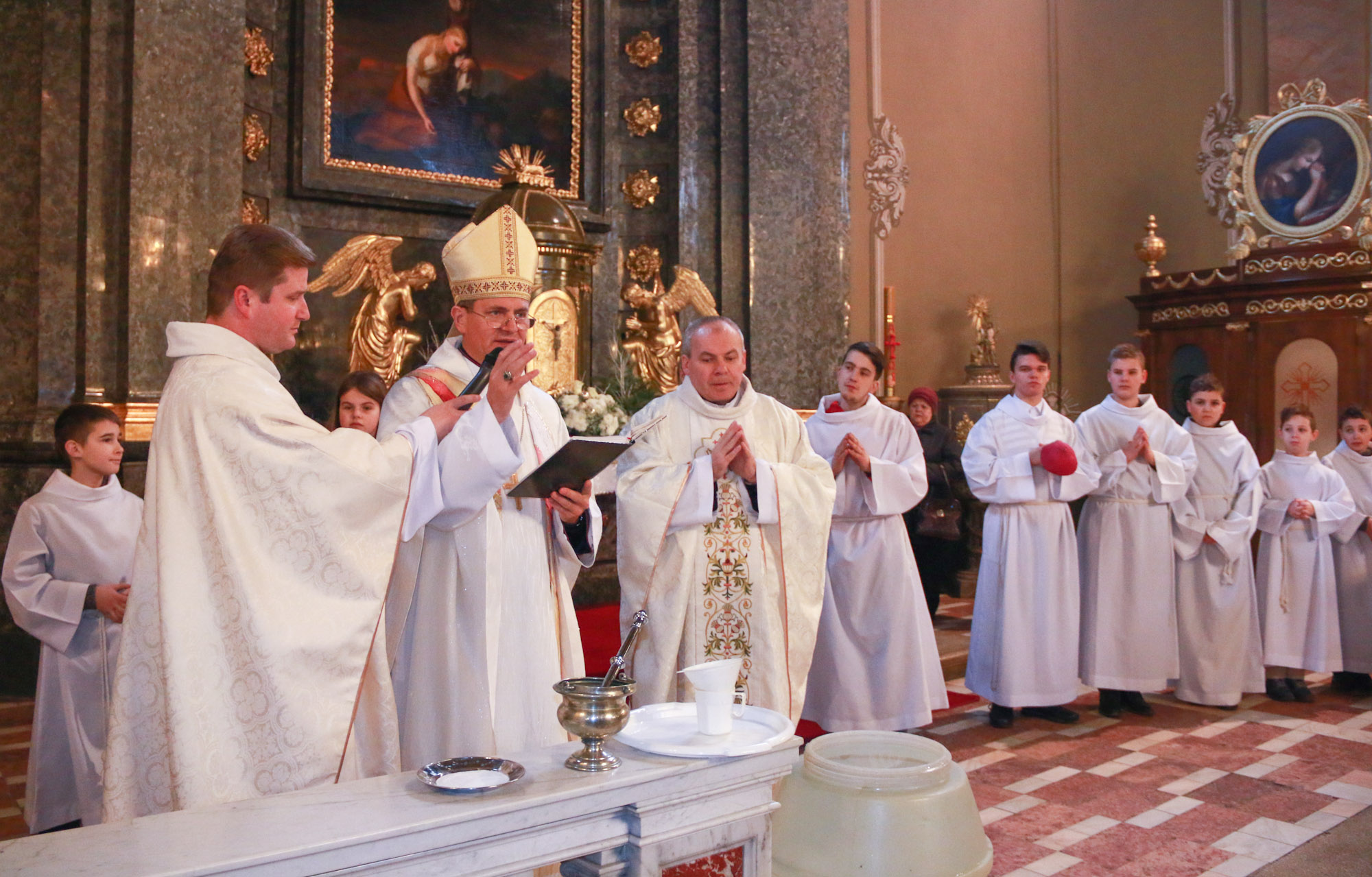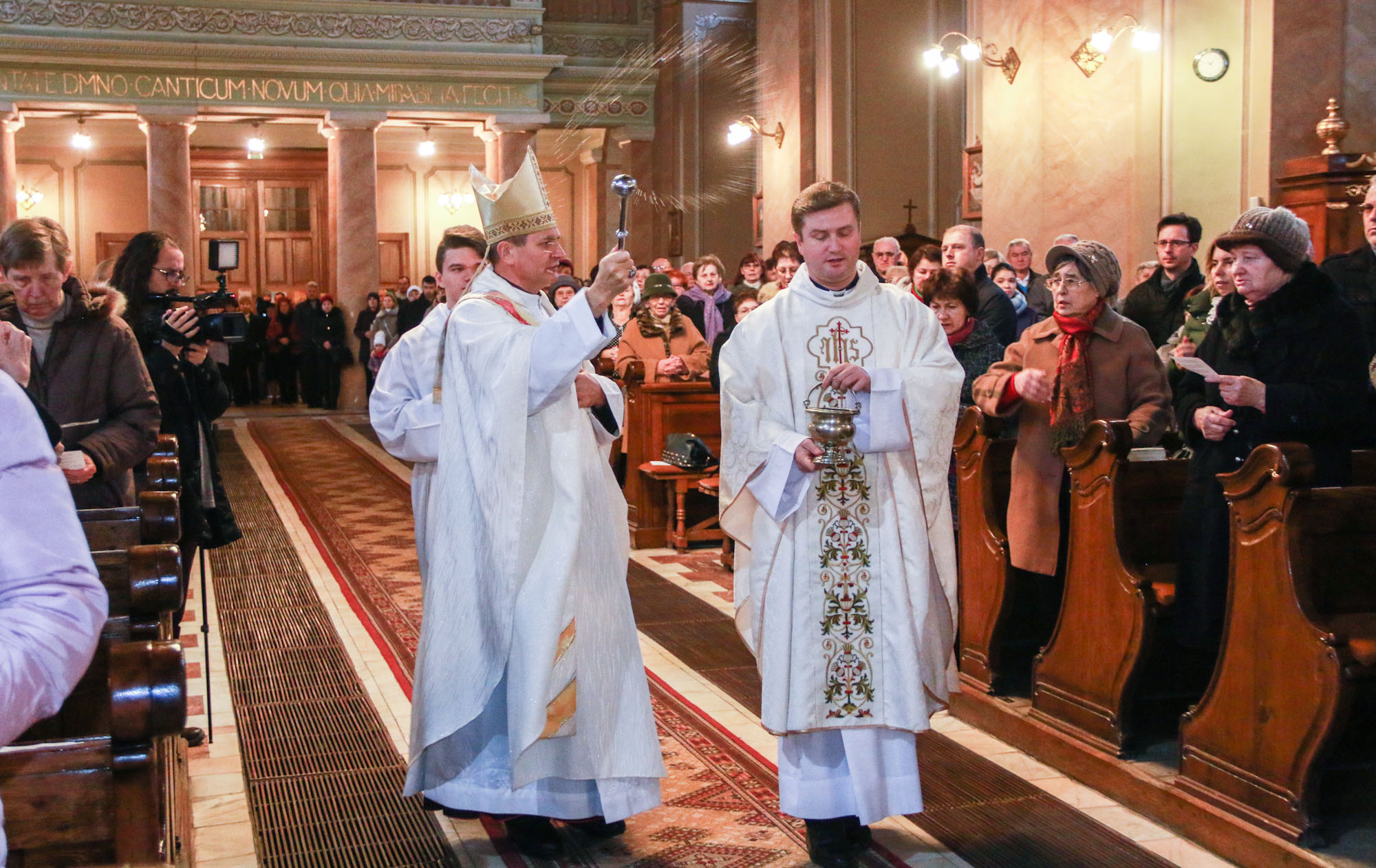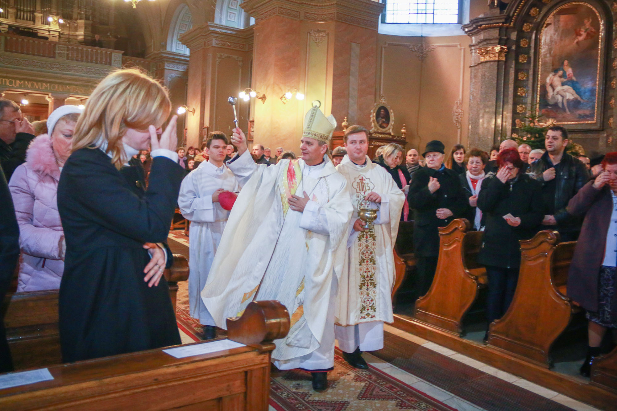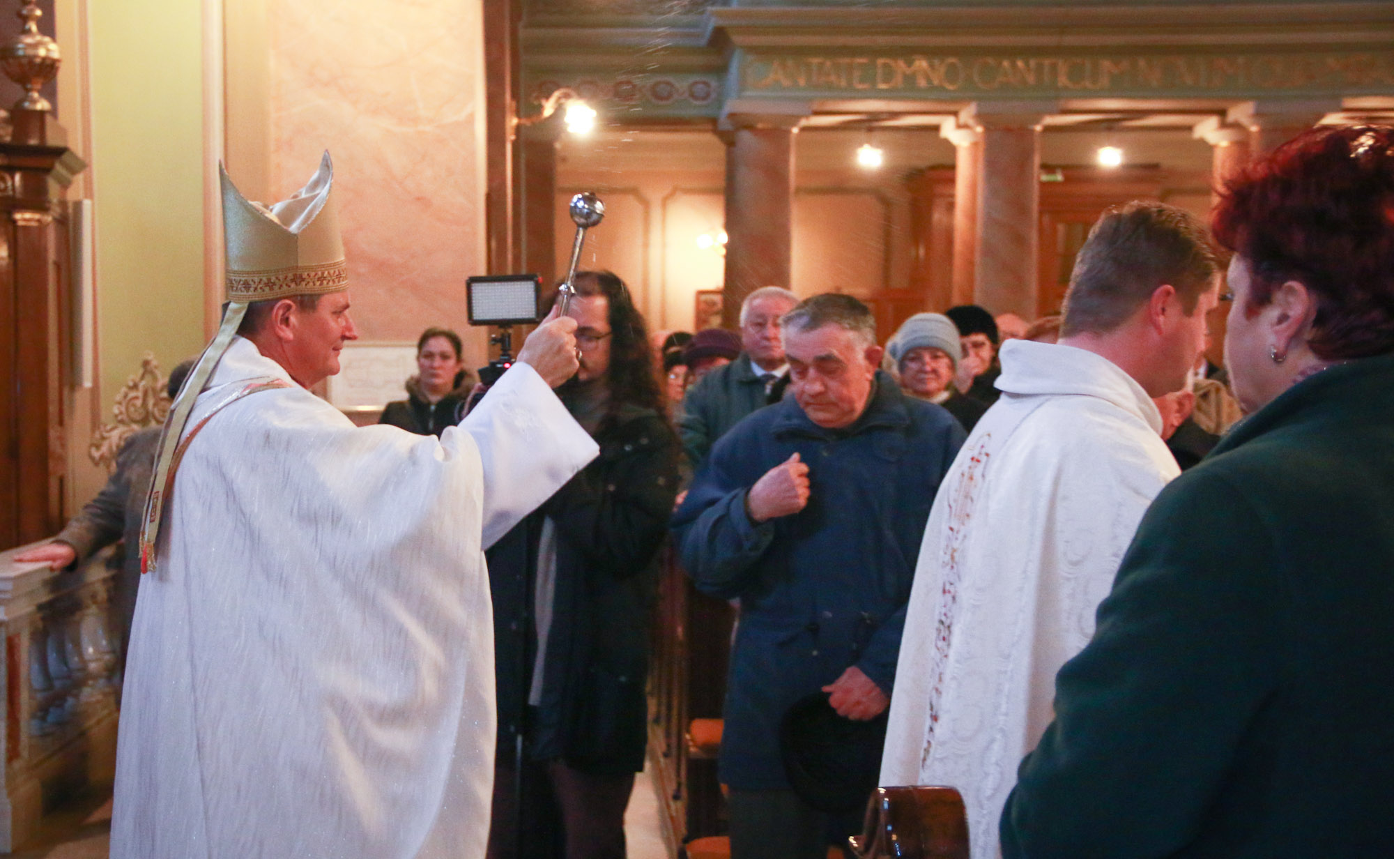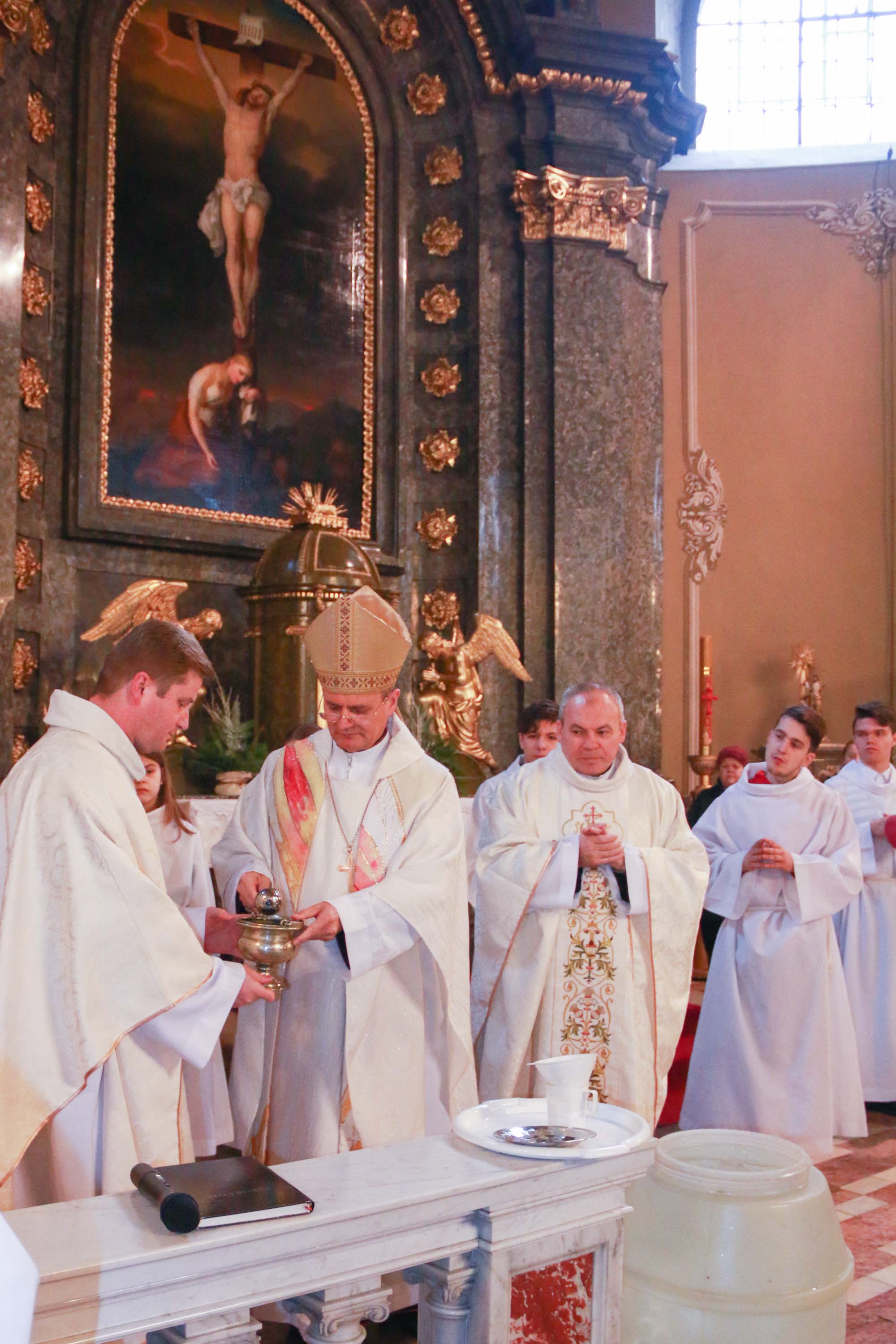 A bevonulást követően Schönberger Jenő püspök is, asszisztenciájával a jobb mellékoltárnál elhelyezett, vizet tartalmazó edényekhez vonult, s ott megáldotta a sót, amit amit a vízbe öntött. Megáldotta a vizet is, majd meghintette vele a híveket, a keresztségükre való emlékeztetésként. A só megáldásakor így imádkozott: „Mindenható, örök Isten, alázattal kérjük irgalmadat. Áldd meg atyai jóságoddal ezt a sót, amit az emberiség használatára teremtettél. Add, hogy mindazoknak, akik használják, testi-, lelki üdvét szolgálja. Amire hintik vagy amibe vegyítik, az tisztuljon meg a gonosz lélek minden ártó hatalmától és megrontó befolyásától, Krisztus, a mi urunk által.”
