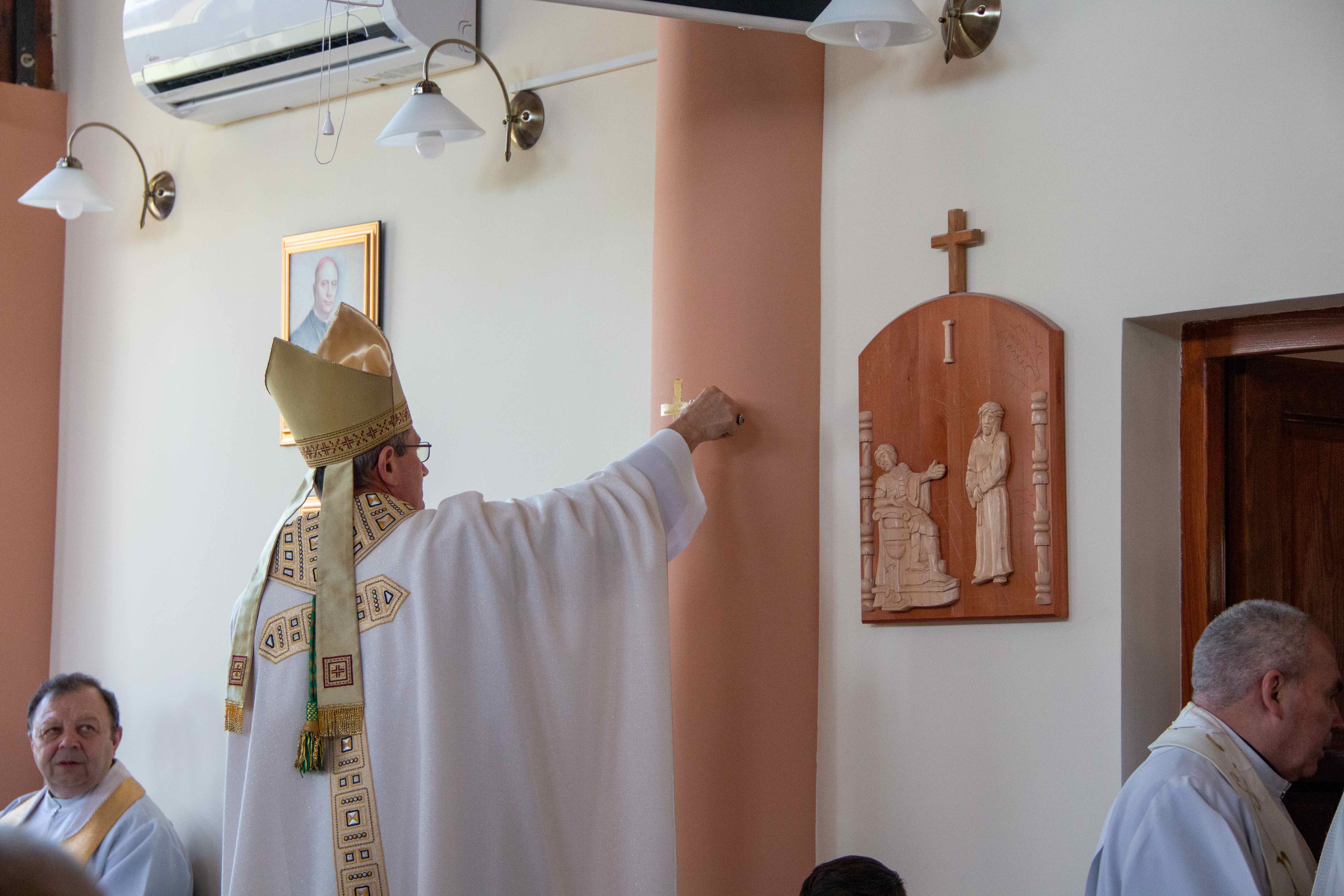 Az újonnan épült templomba bevonulva a Jenő püspök megáldotta a keresztelőkutat, majd szenteltvízzel meghintette a népet.