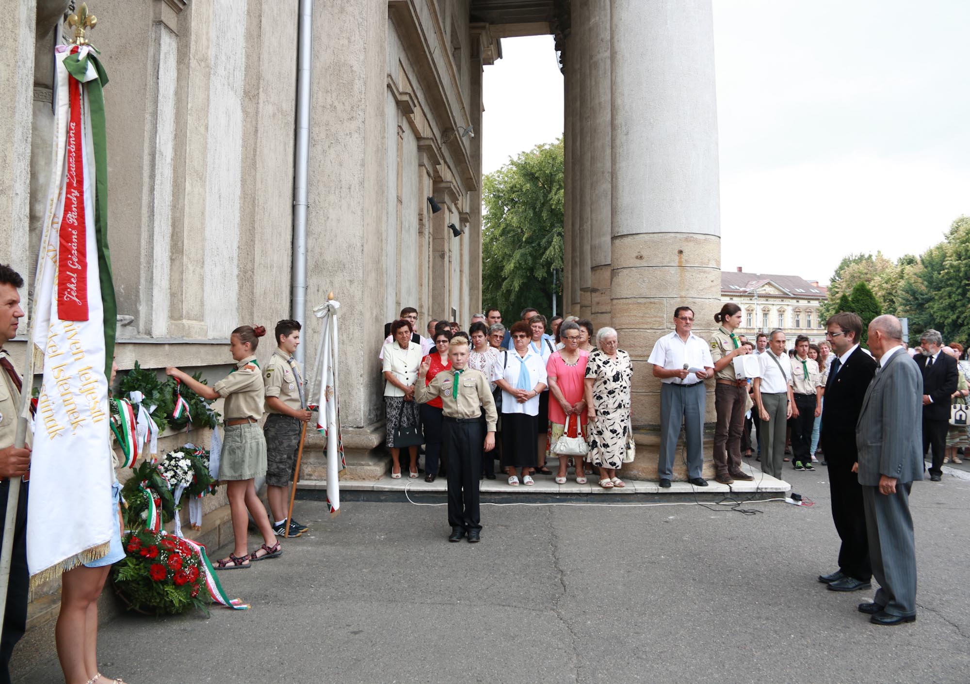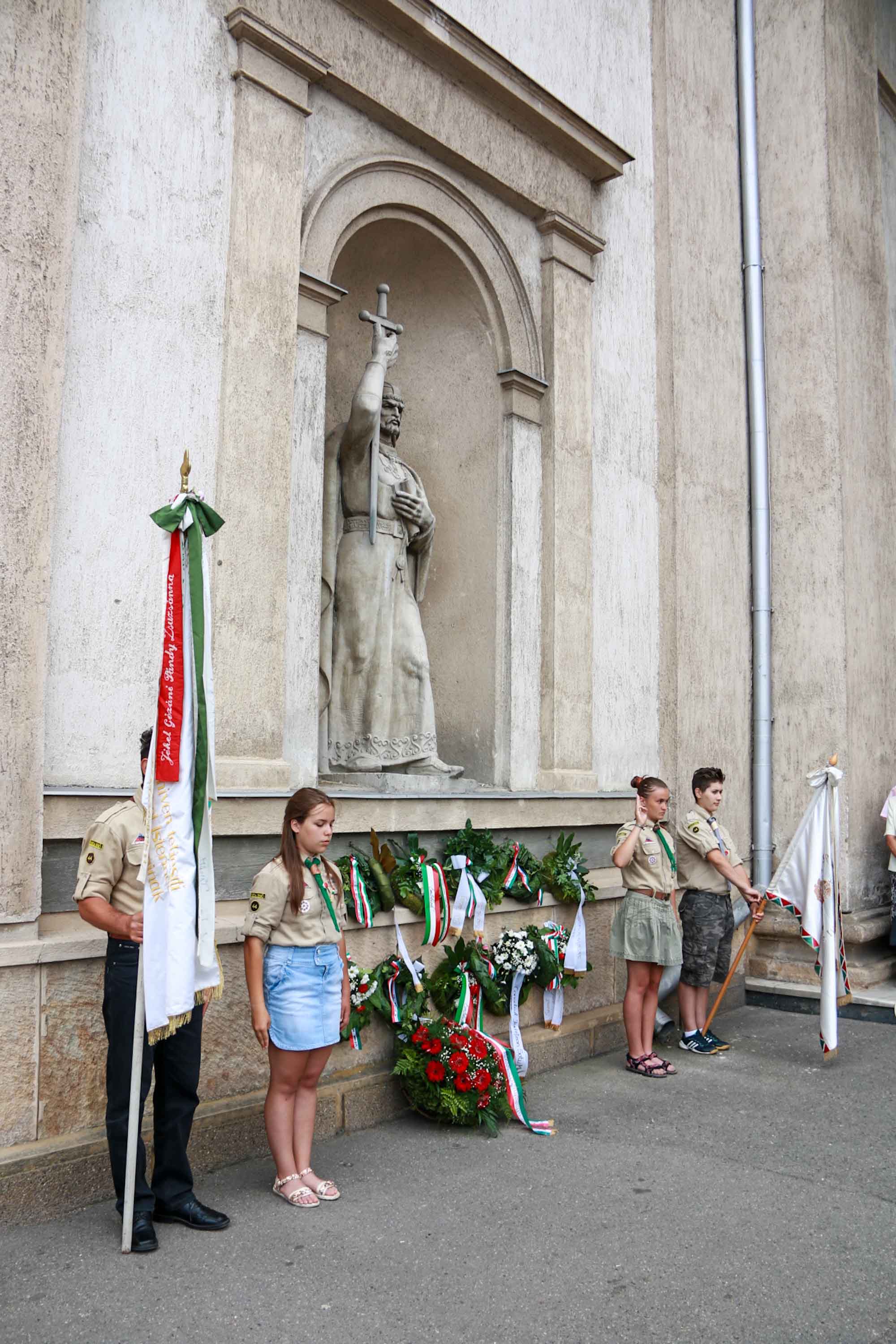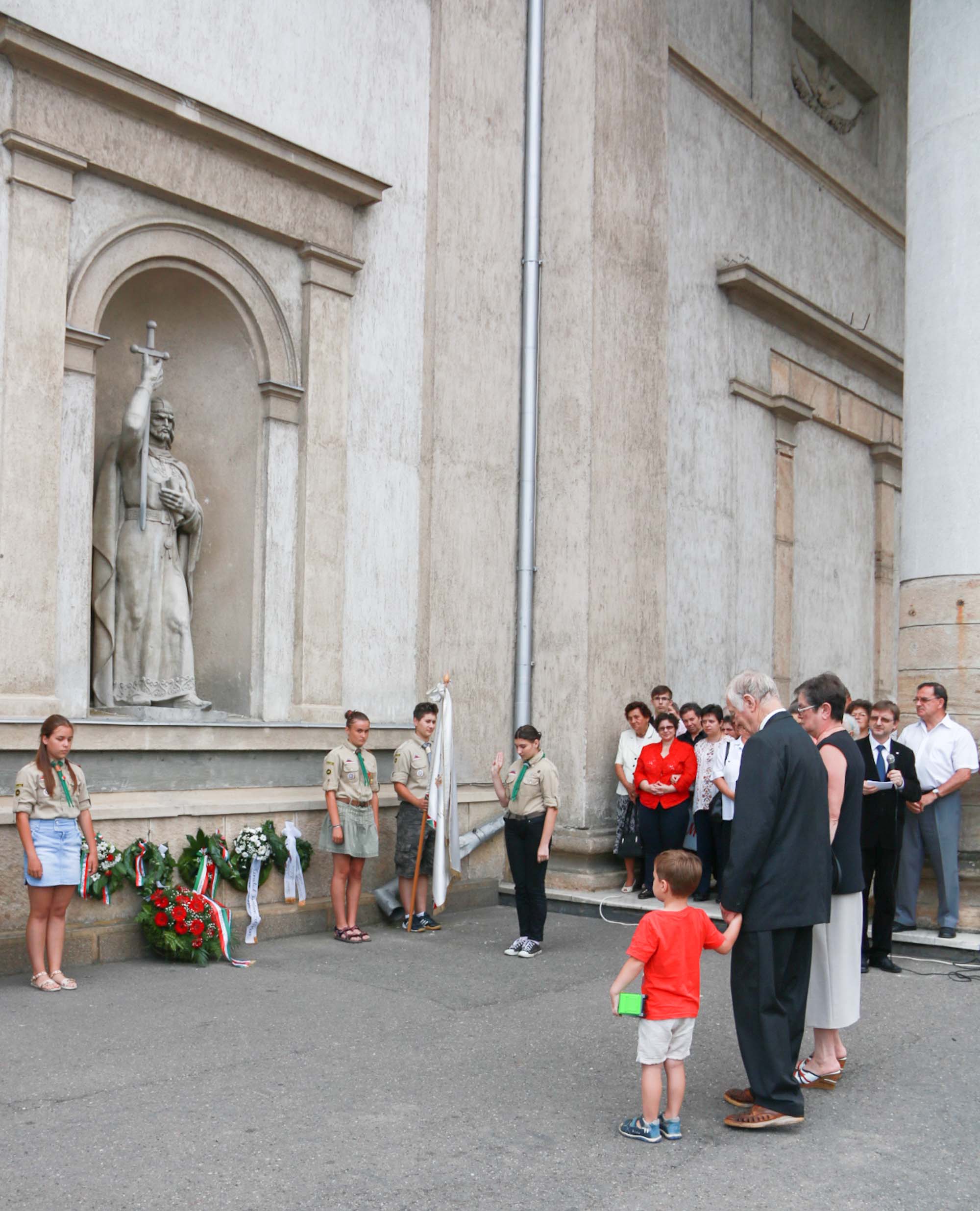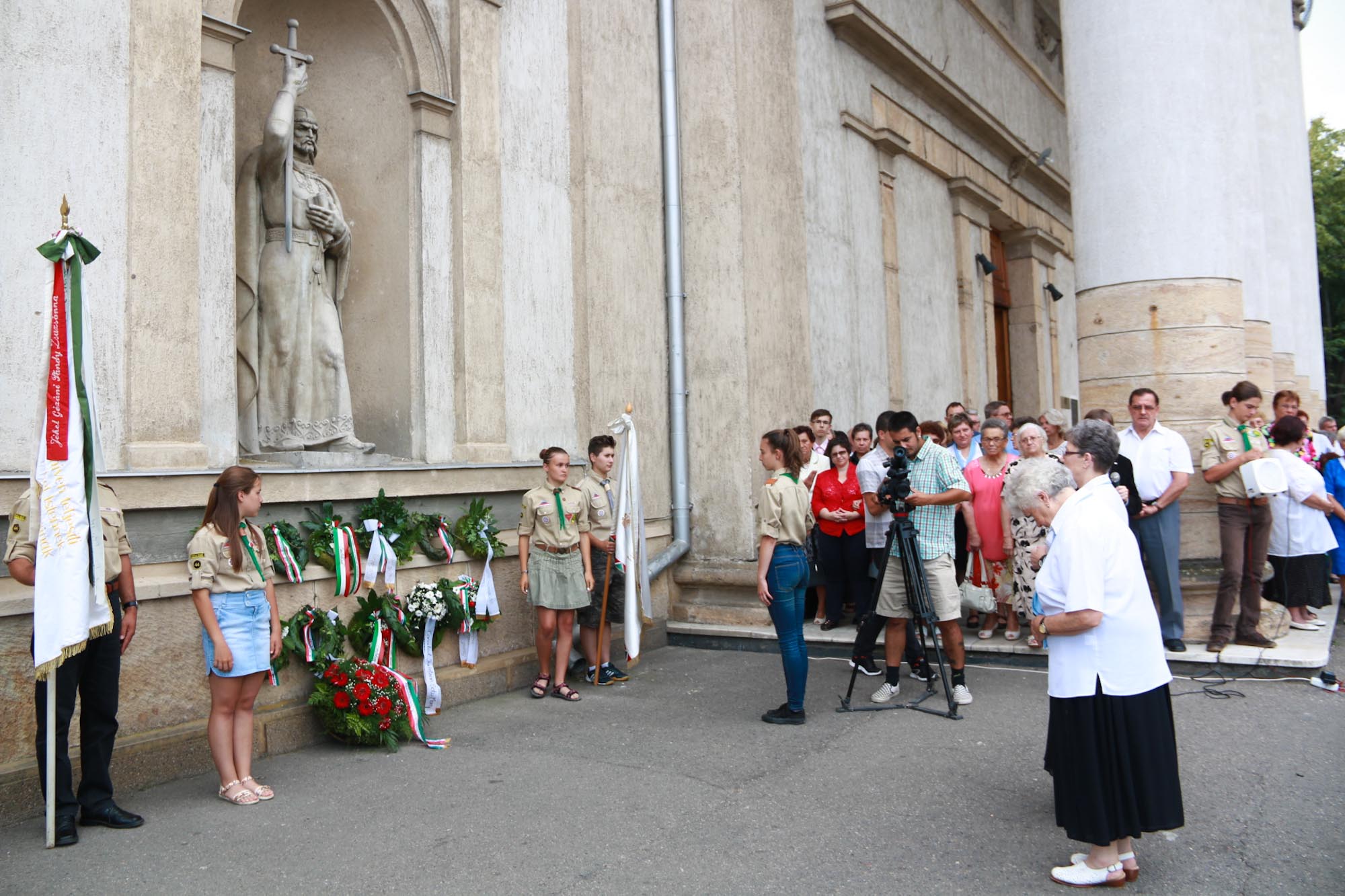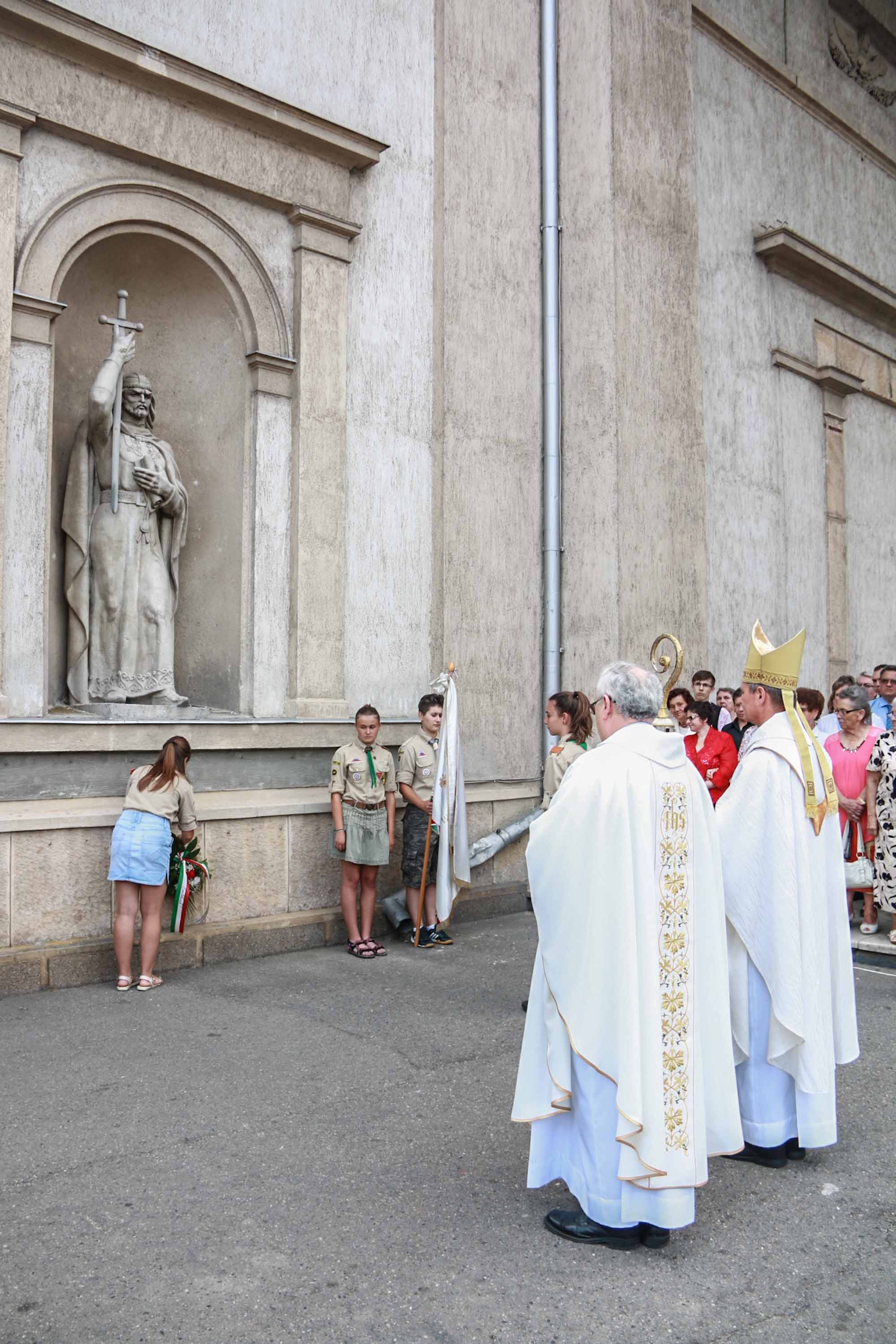 A szentmiseáldozat bemutatása után a püspök és asszisztenciája, a közigazgatási elöljárók, a különböző szervezetek-, intézmények- és közösségek képviselői, a vendégek és hívek a Székesegyház bejáratához vonultak, ahol megkoszorúzták Szent István szobrát.