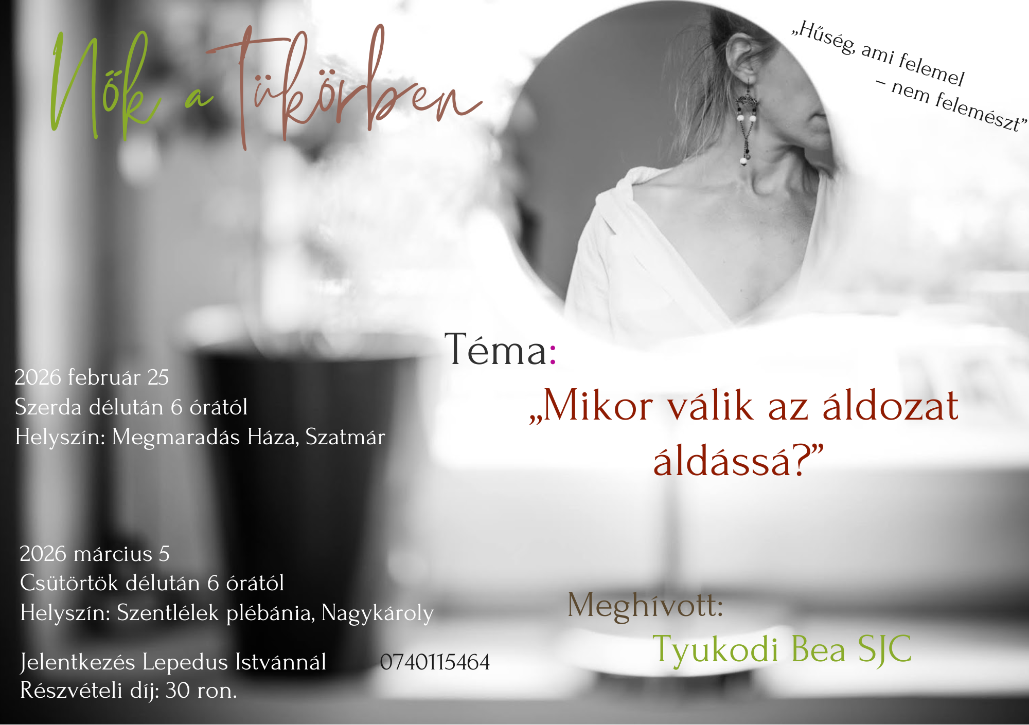 A nagyböjti készület időszakában különösen fontos, hogy időt szánjunk önmagunk, hivatásunk és áldozatvállalásunk mélyebb megértésére. A „Nők a tükörben” sorozat következő alkalma erre a belső útra hívja a résztvevőket, segítve a mindennapi élet kihívásainak hit fényében való szemlélését.