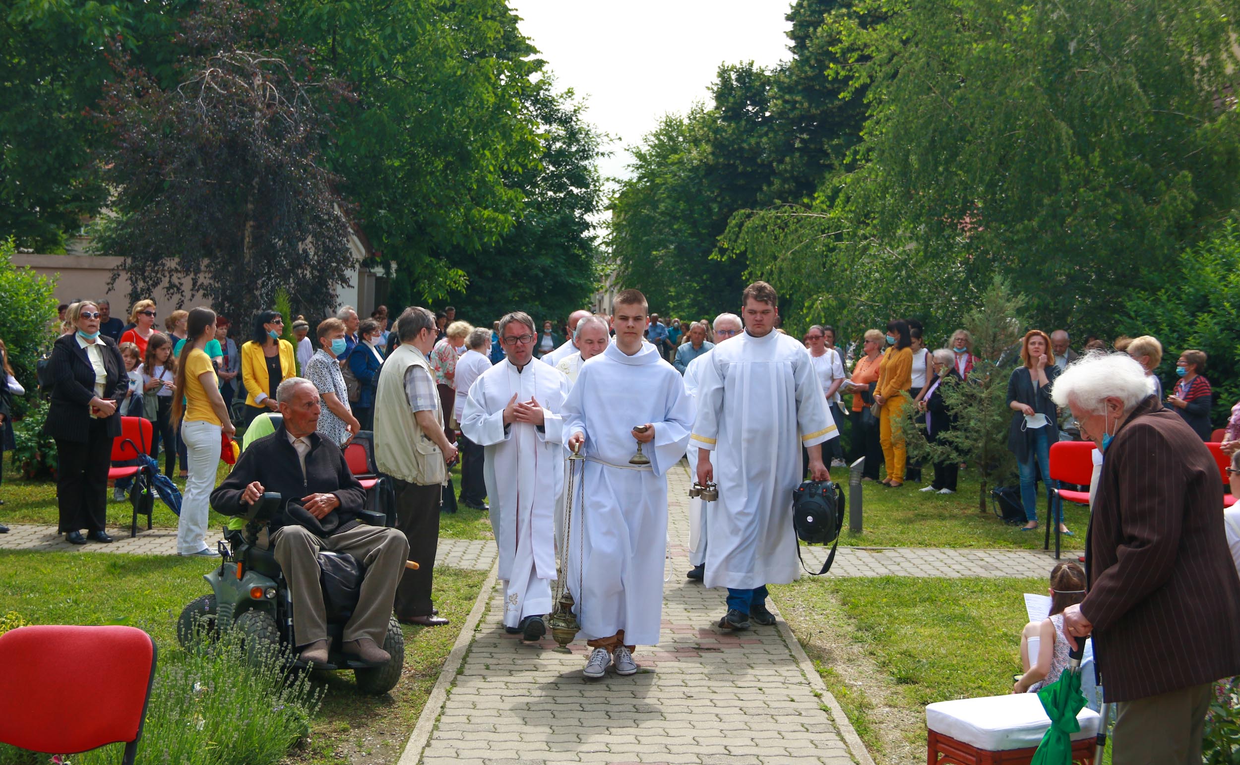 Úrnapja, a mi Urunk Jézus Krisztus szent Teste és Vére ünnepe. Nélküle semmi vagyunk, vele minden – így vezette be gondolatait Schönberger Jenő püspök a június 11-én, délelőtt tíz órától a Kálvária templom udvarán tartott ünnepi szentmise elején. A világjárvány miatt nem a templomban, hanem szabadtéren összegyűlt, valamint az internetes közvetítés által bekapcsolódott híveknek a főpásztor Isten folyamatos és valós jelenlétét hangsúlyozta. „Istennek a legcsodálatosabb szeretetét ünnepeljük. A Mindenható az Oltáriszentségben valósította meg az ígéretét »veletek vagyok minden nap, a világ végéig«. Együtt ünnepeltük megváltásunk titkait: karácsonykor a megtestesülést, húsvétkor az Úr Jézus kereszthalálát és feltámadását, áldozócsütörtökön Urunk mennybemenetelét, pünkösdkor a Szentlélek Úristen eljövetelét, ma pedig mindennek a beteljesülését. Egyben ünnepeljük mindazt, amit eddig, hiszen az Úr Jézus azért ment a mennybe, hogy elkezdődhessen a szentmise. Attól kezdve az Egyház folyamatosan bemutatja a szentmisét, amiben a Szentlélek erejéből a kenyér és a bor színe alatt jelen lesz a feltámadt Krisztus. Újraszületik az oltárunkon, újra feláldozza önmagát értünk azért, hogy velünk lehessen, hogy bennünk lehessen minden nap. Jézus bennünk akar kilépni a világba. Testvéreim, ti vagytok azok a szentségtartók, amelyek a világban járva megszentelik a világot. Ahova ti léptek, oda lép ma Krisztus. És valahányszor áldozunk, bennünk Krisztus szentel meg mindent jelenlétével.”