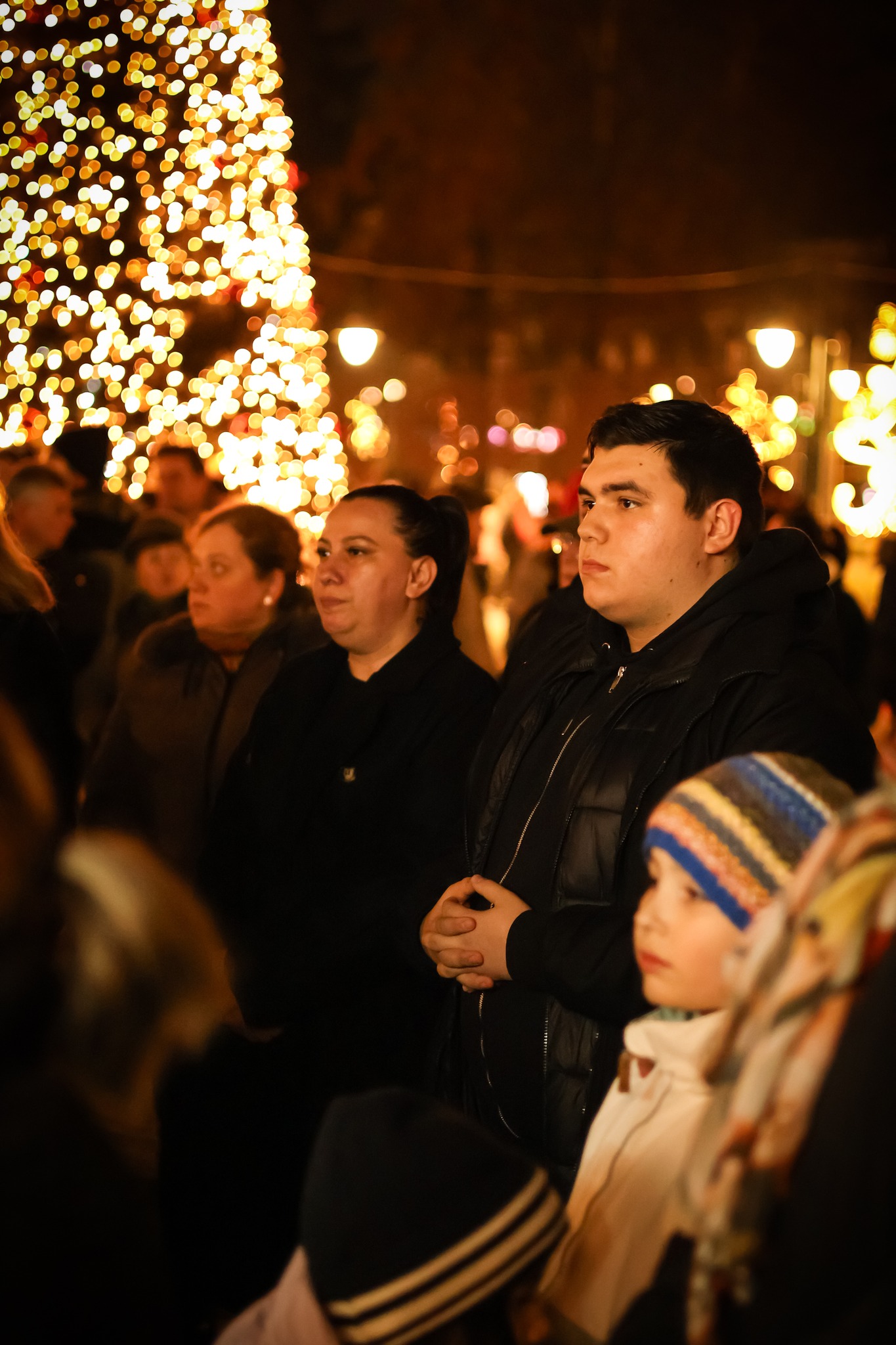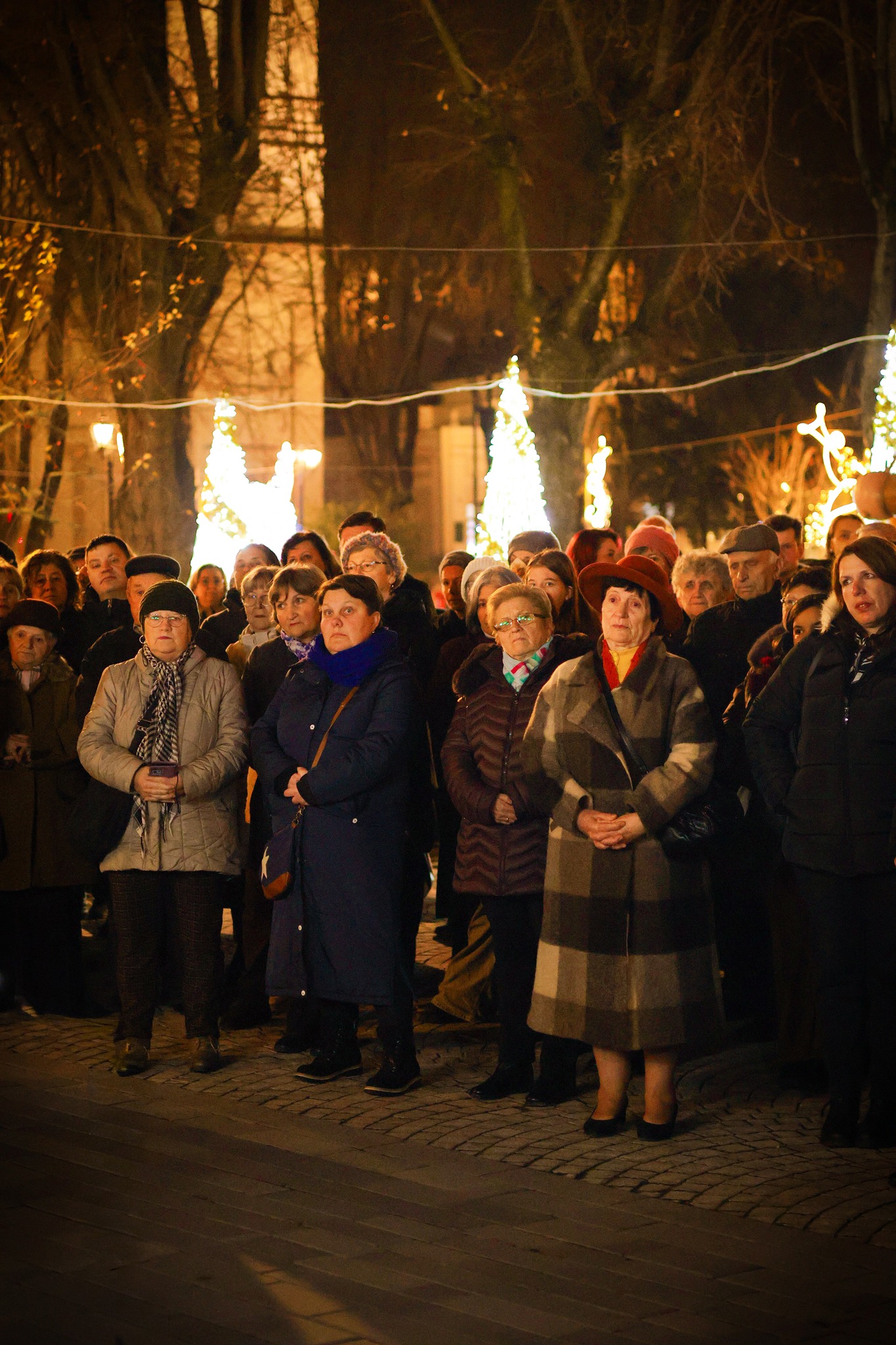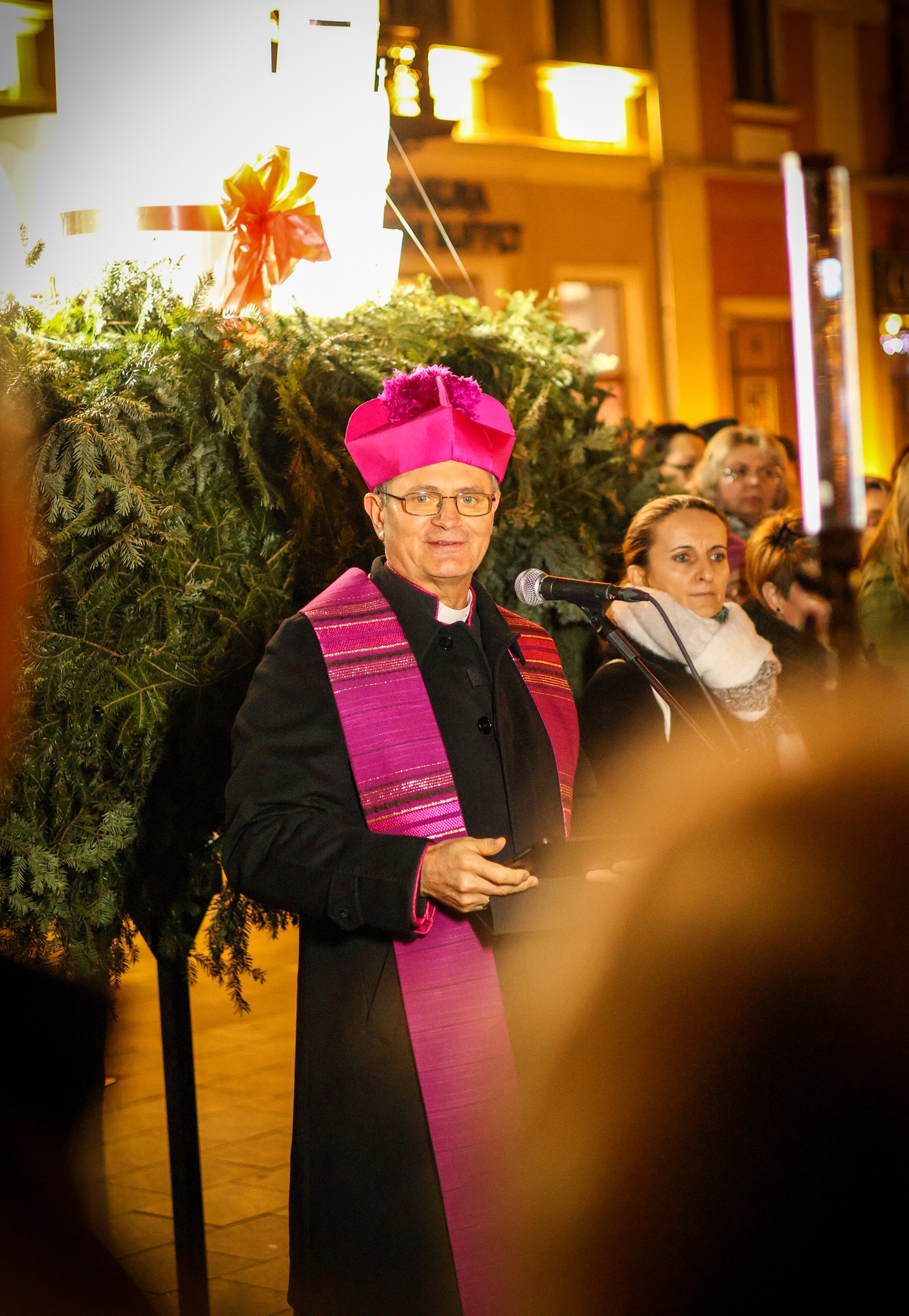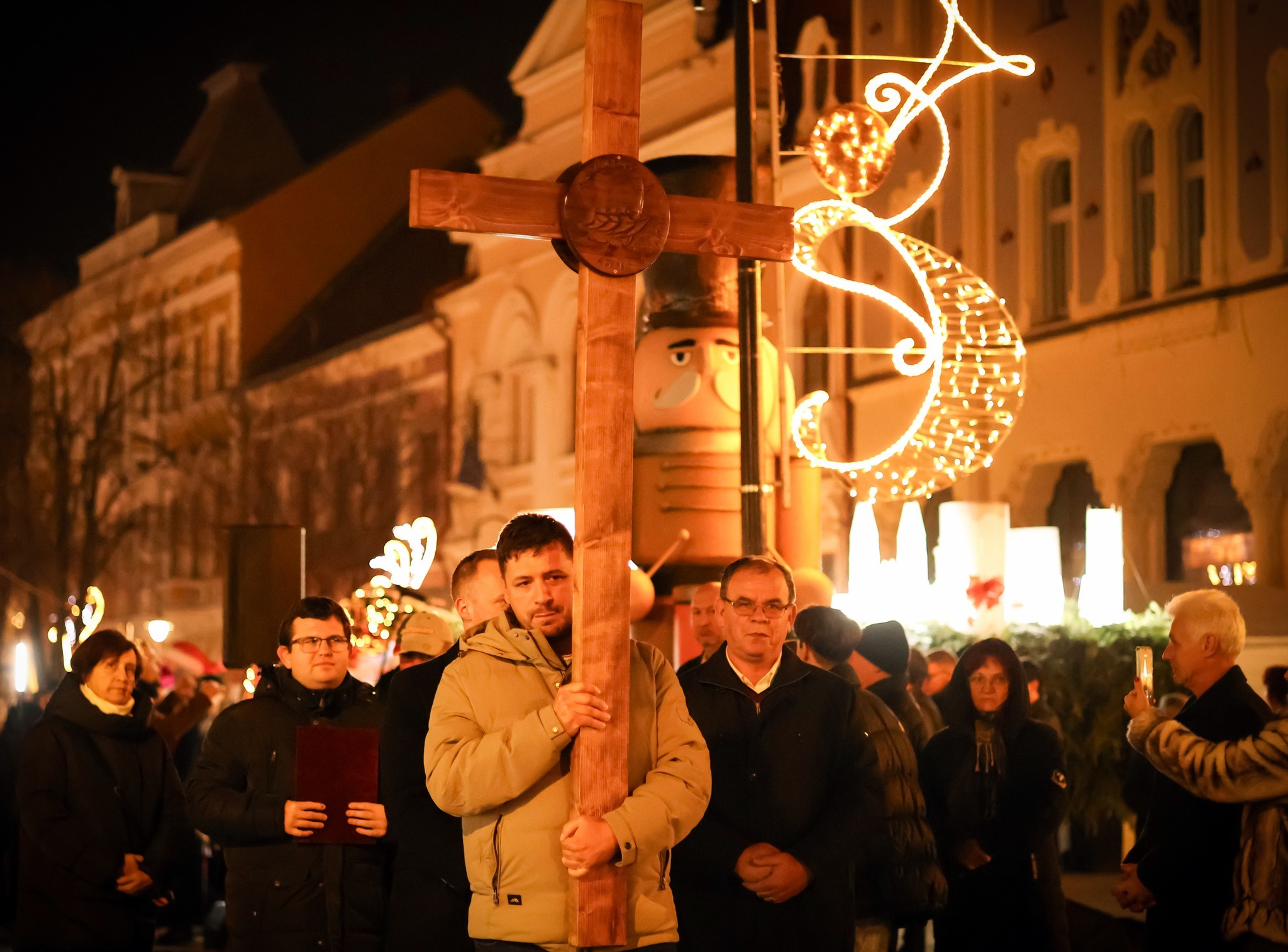 Az esemény a második adventi gyertya meggyújtásával kezdődött a Pannónia szálló előtti koszorúnál, ahol Nm. és Ft. Schönberger Jenő megyéspüspök ünnepi gondolatai hangzottak el: ’’Advent mindig a készületről szól. Készüljünk Karácsonyra, készüljünk a találkozásra, készüljünk, de nemcsak a gyertyák fényével, hanem a saját szívünk rendbetételével is. Most, hogy fellobbant a második gyertya lángja, képzeljétek el, hogy mindenki a maga szívében, ezt a kicsi lángot elviszi. Nem egy fényszórót, nem reflektort, hanem csak egy kicsi lángot… Ha így járnánk a mindennapi életünkben testvérek, akkor ez a világosság beragyogná nemcsak a mi életünket, hanem szeretteink életét is, és ezt a pogány világot.’’