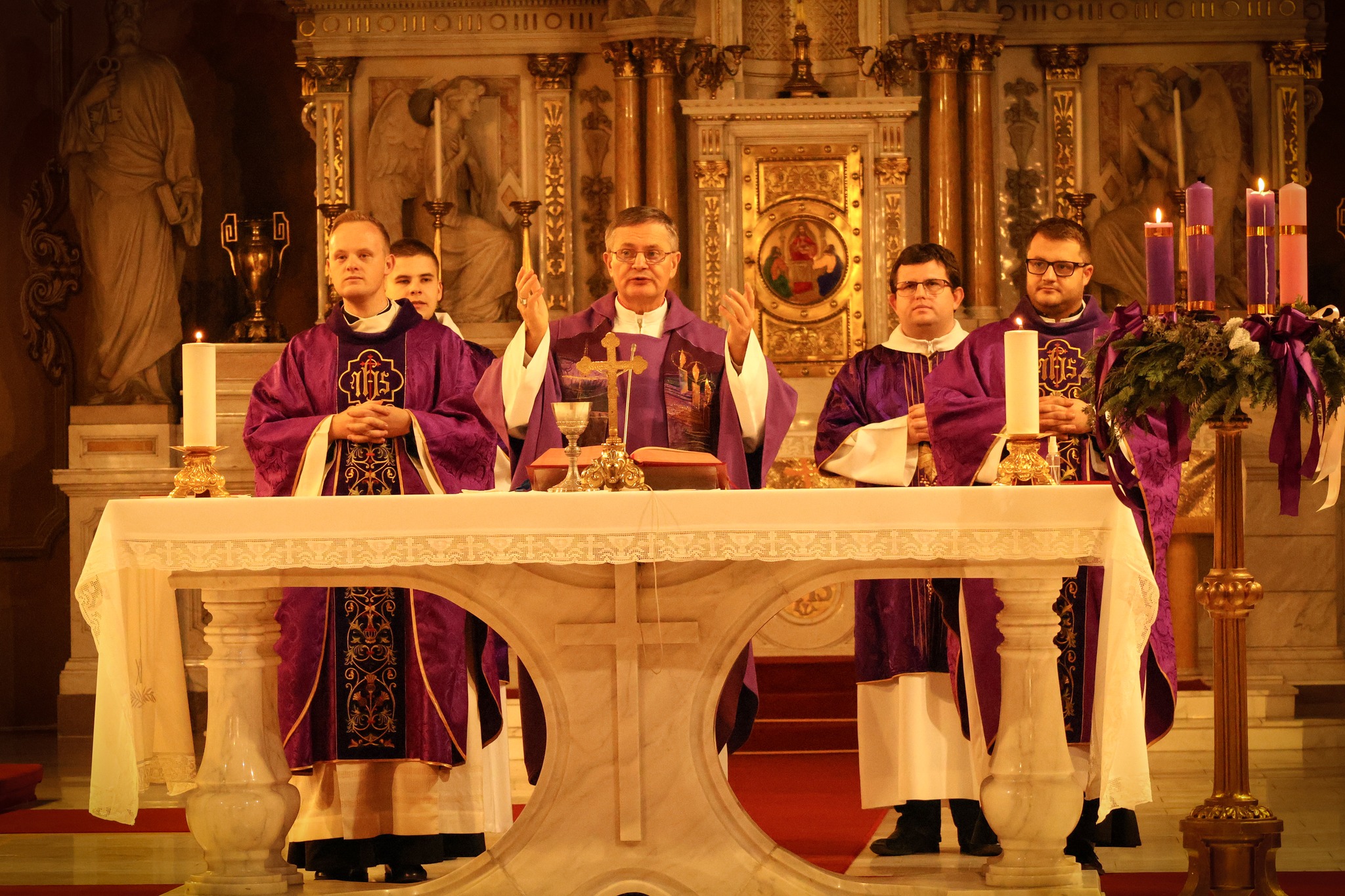 A téren a zenei szolgálatot Fehér Róbert vezetésével a Kis Szent Teréz Plébánia ifjúsági énekkara látta el. Majd ünnepi bevonulás következett a jubileumi kereszttel a Székesegyházba, ahol 18.00 órától az ifjúsági szentmise vette kezdetét, aminek főcelebránsa Nm. és Ft. Schönberger Jenő megyéspüspök volt. A szentbeszédet Ft. Mayer Nándor ifjúsági és ministránslelkész mondta, aki rámutatott: ’’Advent második vasárnapjának üzenete, hogy a csend teremti meg a tiszta, hiteles szó lehetőségét, ahogyan Keresztelő Szent János életében is összekapcsolódott a puszta és a prófétai hang. A belső csendben az ember megszabadul a fölöslegtől, és újra meghallhatja Isten szavát. János keménysége nem harag volt, hanem szeretetből fakadó figyelmeztetés a képmutatás veszélyére. Aki alázattal közeledik, az új életet talál, mert Isten a nyitott szívet fogadja el, nem a látszatot. Advent így a visszafordulás, a megtisztulás és az újrakezdés kegyelmi idejévé válhat.’’